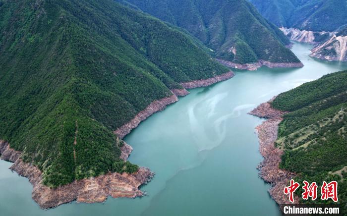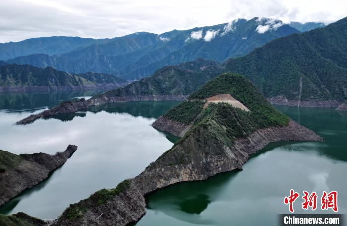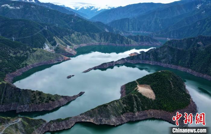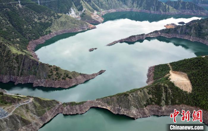 圖為6月25日,航拍蜿蜒山間的天龍湖。(無人機(jī)照片)中新社記者 王磊 攝