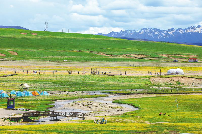 6月24日,記者一行乘車(chē)行駛在四川省阿壩藏族羌族自治州九紅草原風(fēng)光路紅原段,窗外掠過(guò)一幕幕美景:草原上遍地金黃色小花,小溪蜿蜒流過(guò)花叢,遠(yuǎn)處群山披著斑駁的“雪衣”。
