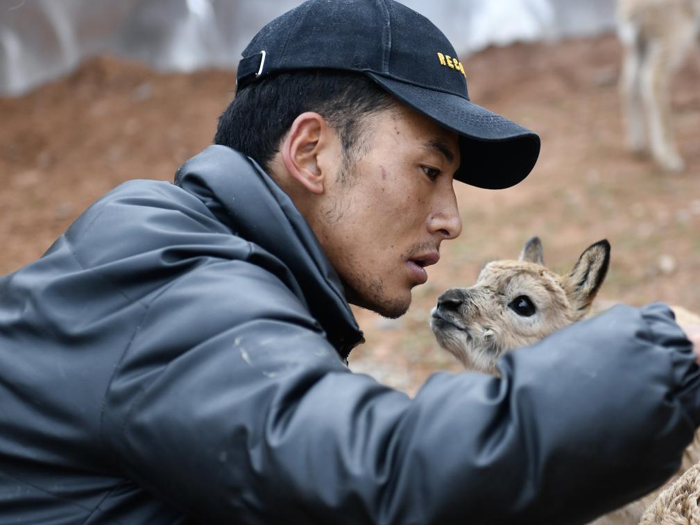2020年7月7日,在可可西里卓乃湖保護(hù)站,保護(hù)隊(duì)員才文多杰照顧一只藏羚羊幼仔。新華社記者 張龍 攝
