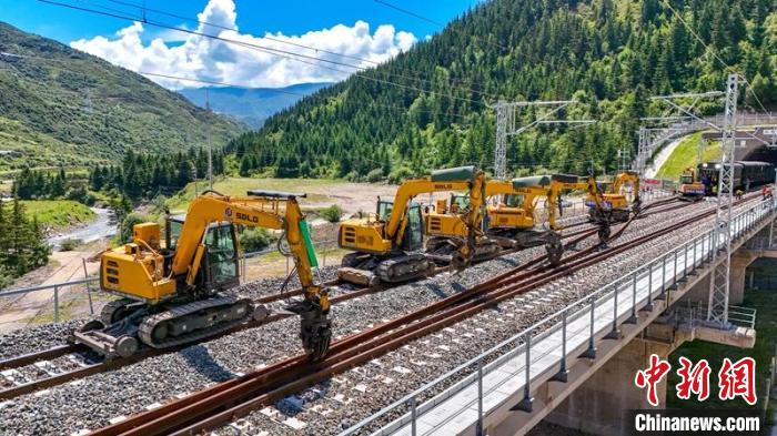 川青鐵路鎮(zhèn)黃段500米長軌鋪設采用“直鋪法”和“換鋪法”相結合的方式組織施工,無砟道床采取“直鋪法”施工,有砟道床采取“換鋪法”施工,利用工具軌鋪通右線,作為工程路料運輸主線,同時兼顧左線鋪軌、長軌焊接鎖定及大機搗固穿插施工作業(yè)?!盀榇_保鋪軌安全有序推進,專門配置了HXN5型高原大功率內燃機車等80余臺(輛)大型設備開展軌道施工作業(yè)?!睆埲A稱,期間項目部合理分配資源,5天完成100公里長鋼軌鋪設,12天完成100公里無縫線路單元焊接及放散鎖定工作。