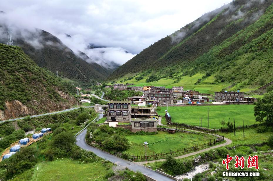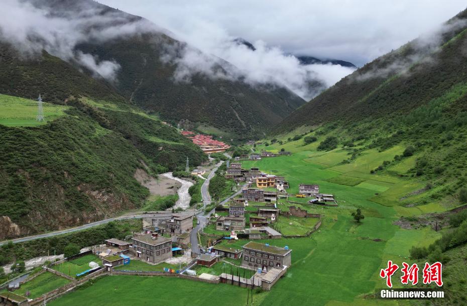 圖為6月27日,航拍措普溝景區(qū)內(nèi)的達塔村。(無人機照片)中新社記者 王磊 攝