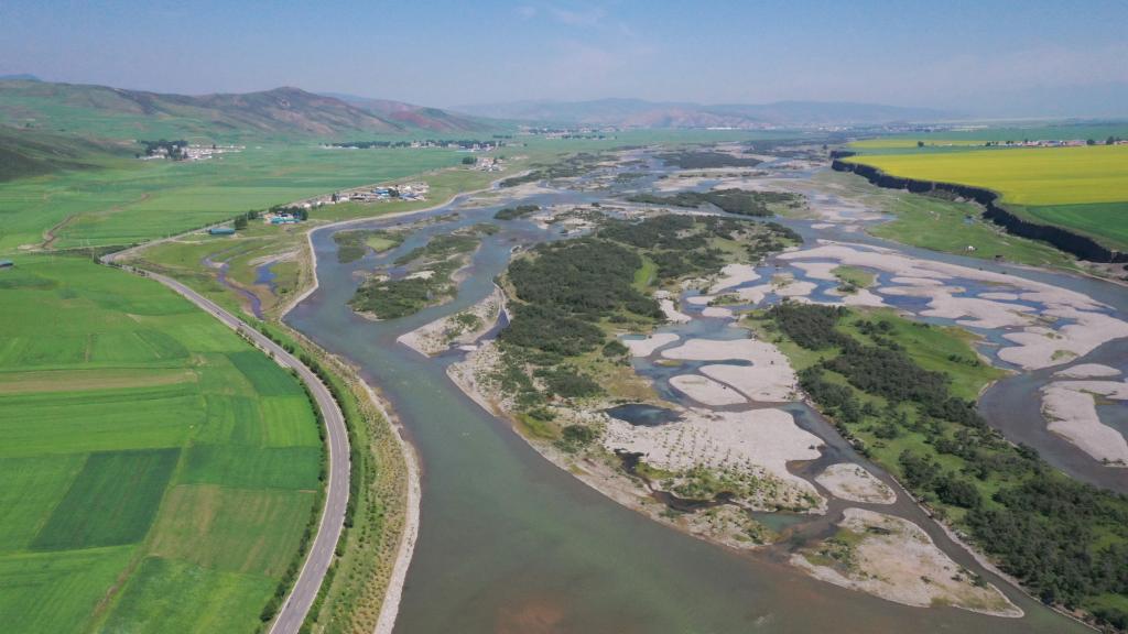 這是2022年6月24日拍攝的祁連山下的大通河(無人機(jī)照片)。新華社記者 李占軼 攝