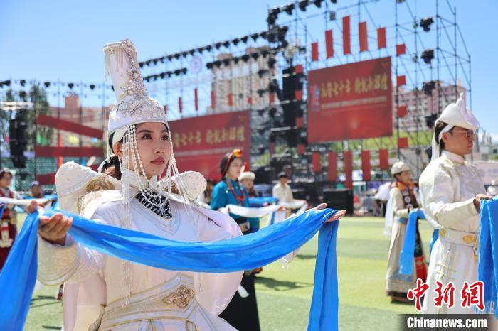 圖為民眾身穿民族服飾、手捧哈達(dá)。中新社記者 張?zhí)砀?攝