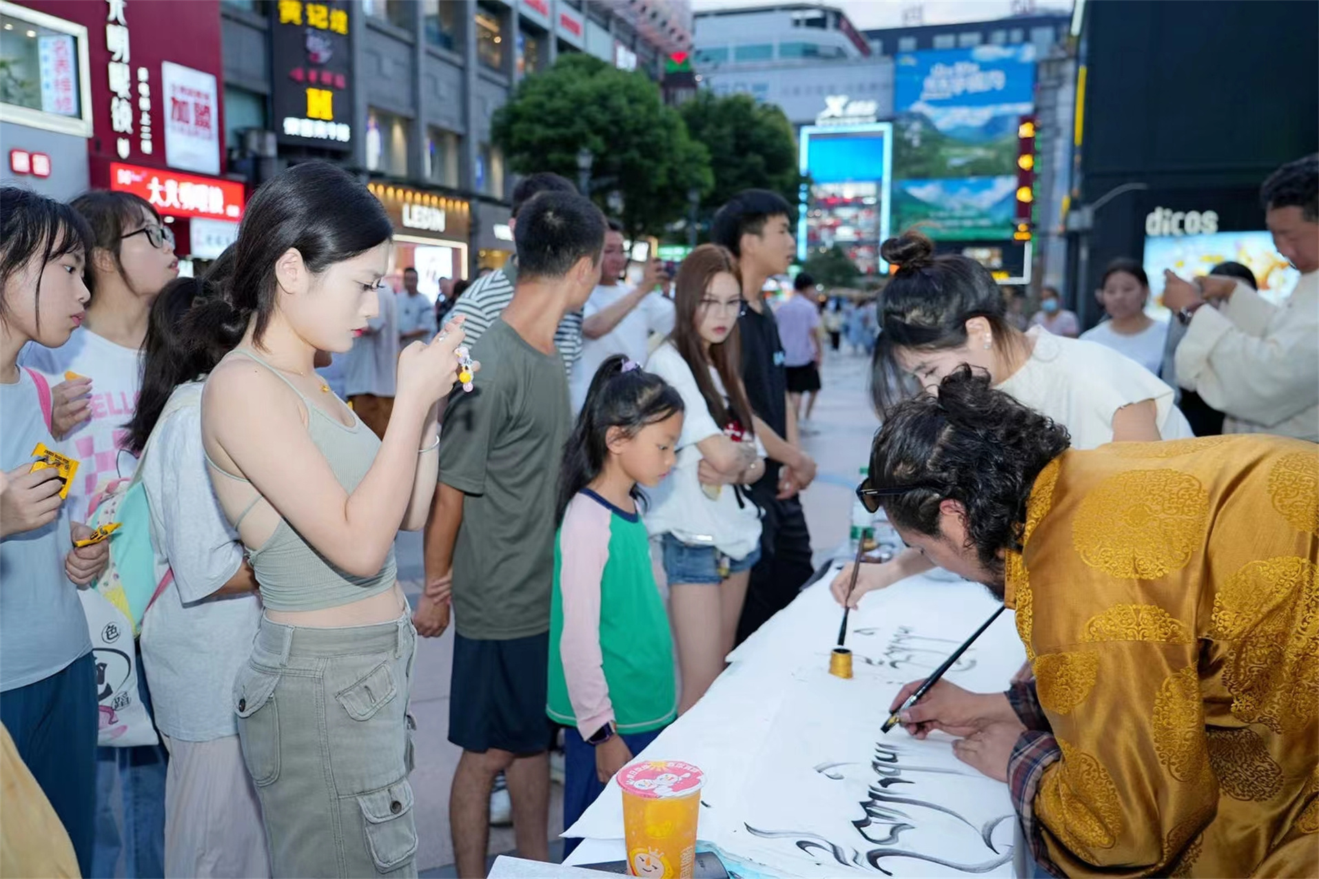 臨近傍晚,在春熙路“丹青繪盛景 筆墨頌祖國”藏文書法展演區(qū),兩位身著藏族傳統(tǒng)服飾的書法老師端坐于案幾之后,他們手持毛筆,蘸取特制的藏墨,在潔白的宣紙上揮灑自如,一筆一劃間流露出濃厚的藏族文化韻味。他們書寫的藏文內(nèi)容多為吉祥如意的祝福語,每一幅作品都蘊含著對美好生活的向往和對遠(yuǎn)方來客的誠摯歡迎。