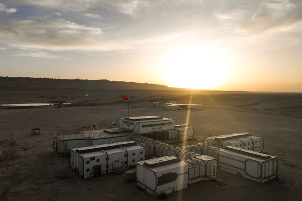 汽車沿“火星一號”公路顛簸前行近百公里,一片由白色集裝箱拼裝而成的營地出現在眼前。這是一個集科學探索、旅游觀光、戶外探險于一體的綜合性營地,走進夢幻般的甬道,太空艙像蜂巢一般立在眼前,仿佛置身于另一個世界。