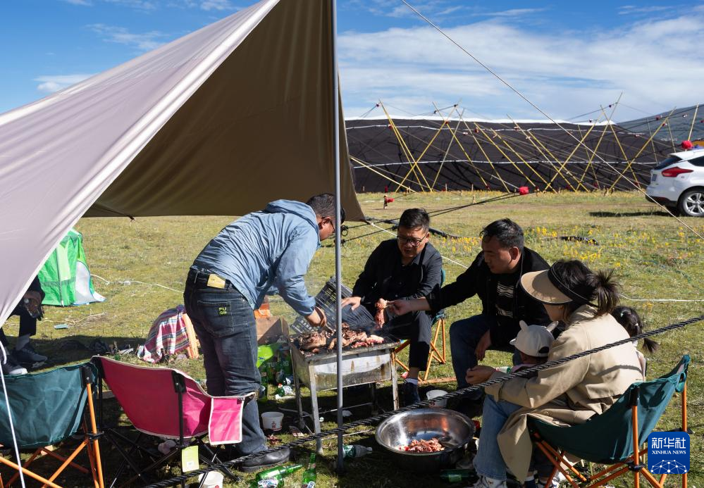 在四川省甘孜藏族自治州理塘縣多旺塘,人們?cè)诓菰现鹛炷豢救猓?月31日攝)。新華社記者 江宏景 攝