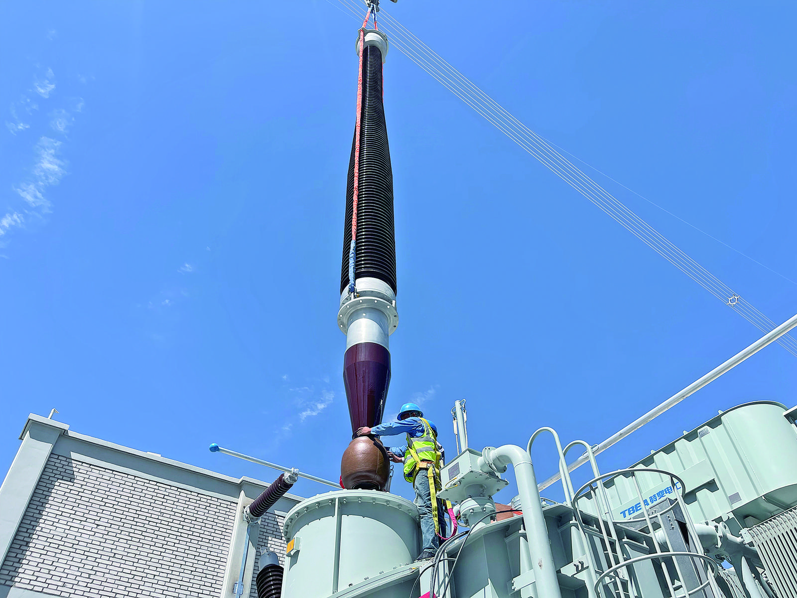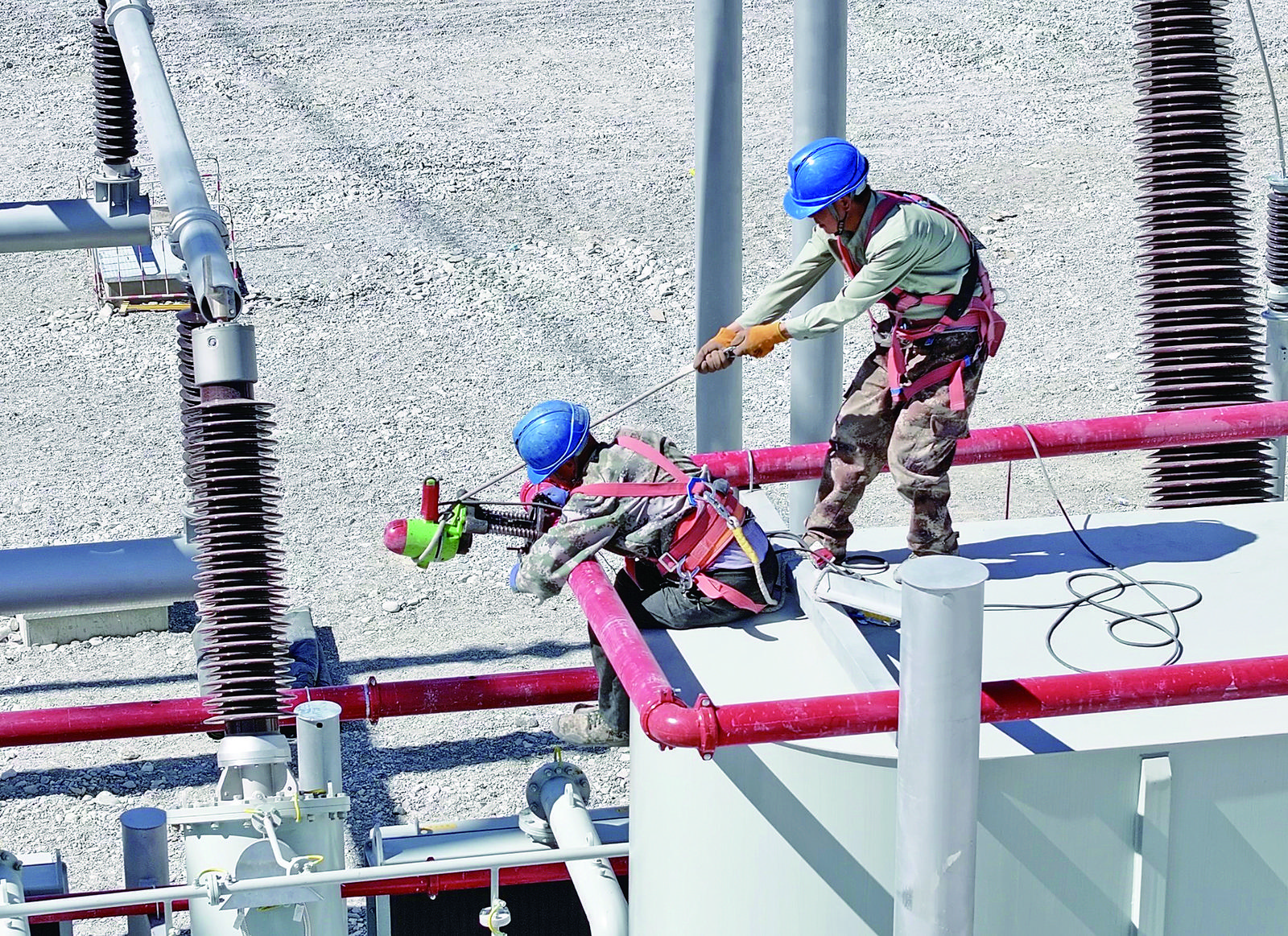 在高明的引導下,記者按規(guī)范要求佩戴好安全頭盔進入施工現(xiàn)場,只見一座座銀色的鋼構(gòu)架高高聳立,變電站已顯露出雛形。施工區(qū)域內(nèi)處處是忙碌的景象,工人們頭戴藍色安全帽,在安全帶等安全設備的保護下,正揮汗如雨抓緊進行電氣安裝作業(yè);不遠處,一臺臺巨大的吊車伸展手臂,緩緩起吊,將一臺臺沉重的電氣設備精準地吊運到指定位置。