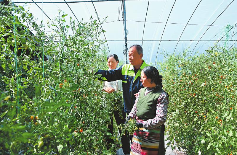 在瑪吉阿米花園農(nóng)莊的大棚內(nèi),山東壽光來的劉振國(中)在指導栽培技術(shù)。四川日報全媒體記者 肖雨楊 攝