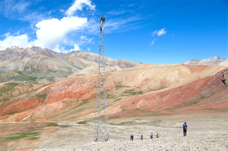 團結(jié)峰下,國網(wǎng)青海省電力公司輸電專業(yè)施工人員正在開展蘇里35千伏輸變電工程組塔安裝工作。許小萍 攝