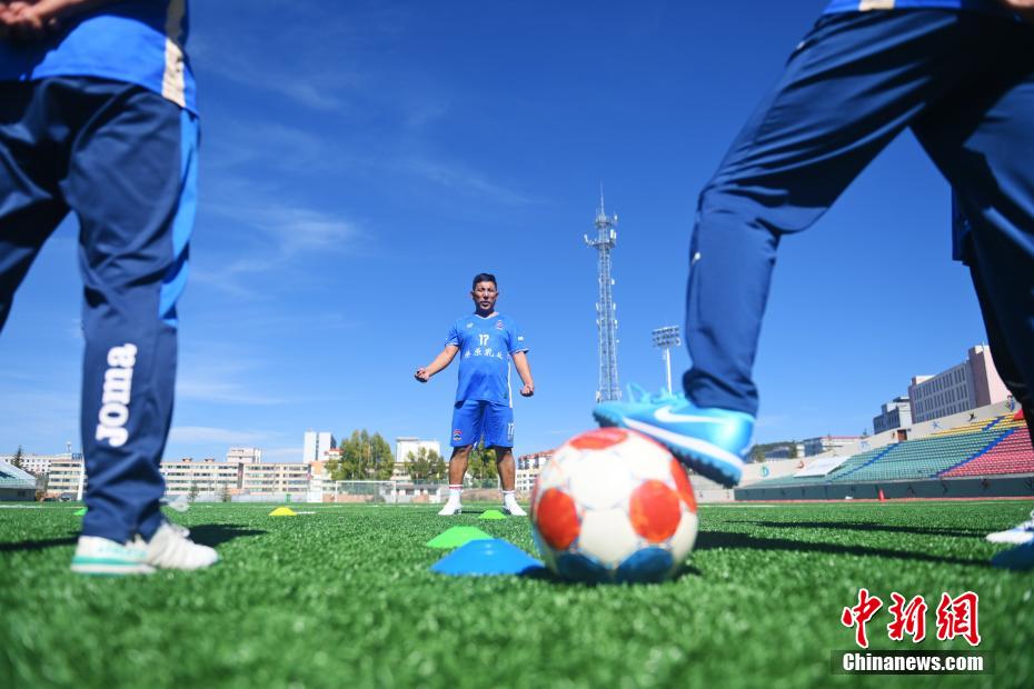10月15日,在甘肅省甘南藏族自治州合作市一足球場內(nèi),甘南九二聯(lián)隊隊長久西道杰指導球員球技。