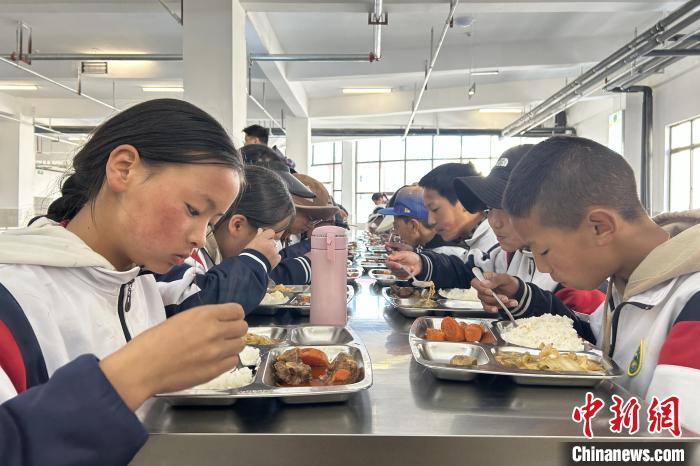 近日,中新社記者來(lái)到色達(dá)縣中學(xué)東校區(qū)時(shí),學(xué)生們正在吃早餐。這座2023年8月建成的學(xué)校是寄宿制,占地100畝。澤讓措很喜歡這里的飯菜——早餐是蛋炒飯或牛肉炒飯,午餐和晚餐都是一葷一素。
