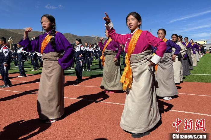 近日,色達(dá)縣中學(xué)東校區(qū),學(xué)生們?cè)谔刈邋伹f舞。中新社記者 王鵬 攝