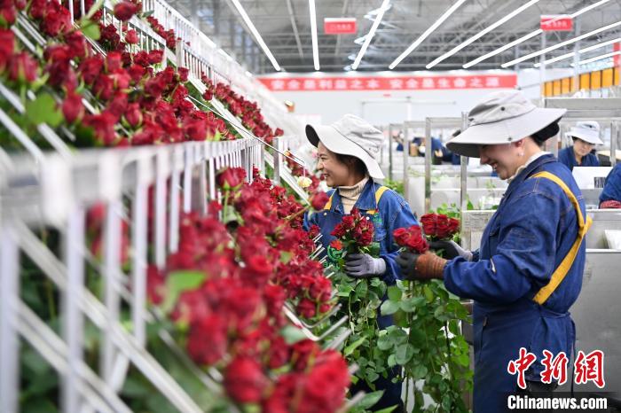 甘肅臨夏回族自治州臨夏市23日寒風(fēng)正勁。步入該市枹罕鎮(zhèn)青寺村的百益億農(nóng)國際鮮花港內(nèi),暖意正濃。引自荷蘭的多個(gè)品種玫瑰花競相開放,它們即將被打包發(fā)往北京、上海、廣州,以及東南亞等地。