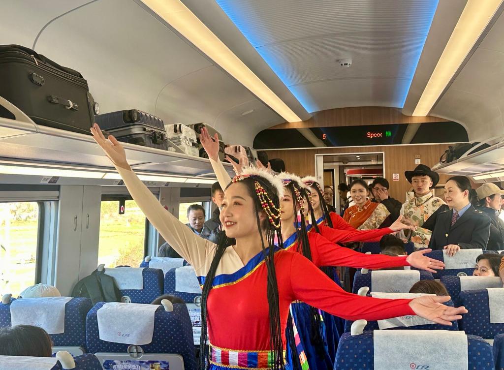 11月25日,“發(fā)現(xiàn)最美鐵路·尋夢香格里拉”活動中,乘務員向游客介紹麗香鐵路并表演節(jié)目。新華社記者 陸君鈺 攝
