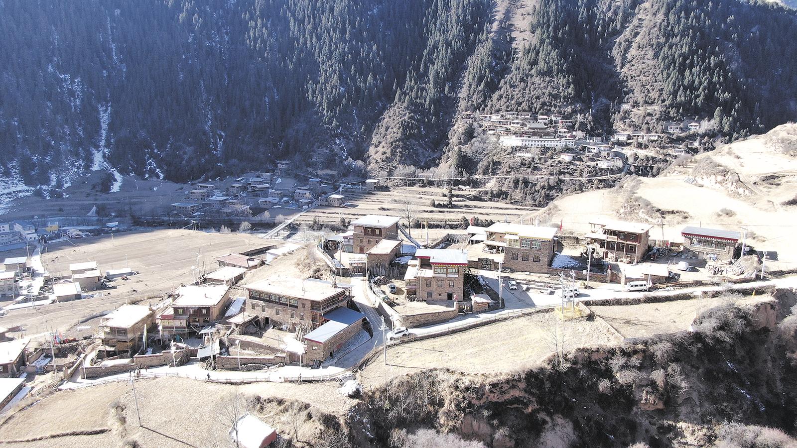 1月13日,記者從班瑪縣出發(fā),沿著蜿蜒的瑪珂河一路南下,來到了“中國(guó)保存最完好的藏式碉樓群落之一”的班瑪縣燈塔鄉(xiāng)班前村。走進(jìn)班前村,只見四面群山環(huán)繞,不遠(yuǎn)處,結(jié)著冰的瑪珂河像一條白絲帶,在陽光的照耀下格外耀眼。依山傍水的班前村地勢(shì)起伏較大,行走其間多半為上坡路,不一會(huì)兒,記者來到一處相對(duì)平坦的房屋前,上面掛著的匾額上赫然寫著“中國(guó)傳統(tǒng)村落——班前村”。