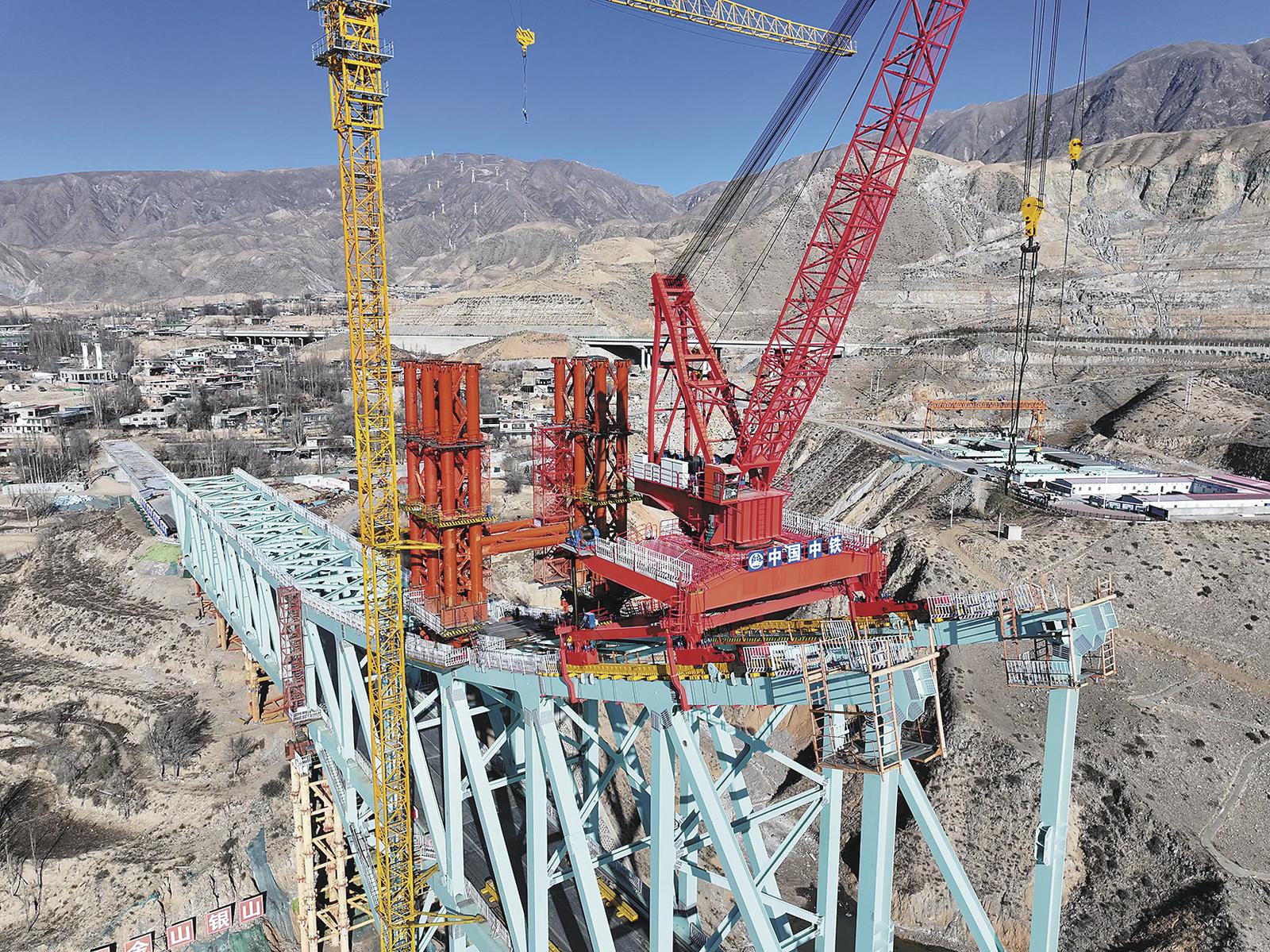“川青鐵路尖扎黃河特大橋主橋鋼桁拱架設(shè)進(jìn)度過(guò)半。”看著這一片熱火朝天、有序建設(shè)的場(chǎng)景,川青鐵路11標(biāo)中鐵大橋局項(xiàng)目黨支部書(shū)記瞿小荃滿(mǎn)懷信心地介紹起項(xiàng)目進(jìn)度,“黃河北岸已經(jīng)完成第14節(jié)間架設(shè),南岸完成第12節(jié)間架設(shè),主橋需要完成50個(gè)節(jié)間,目前共完成26個(gè)節(jié)間架設(shè)。”