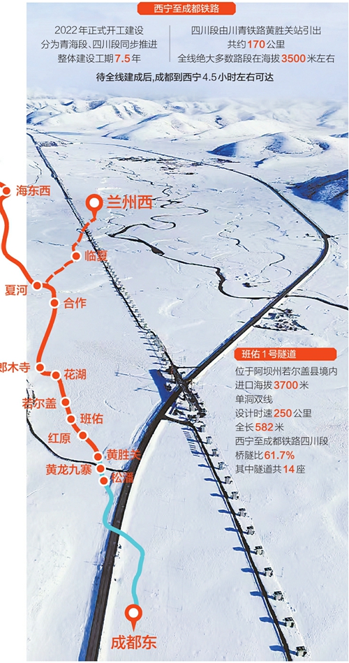 茫茫雪原中,鐵路建設(shè)還在向前推進(jìn)。待西寧至成都鐵路全線建成,兩地鐵路旅行時間將縮短至4.5小時左右,較目前省時一半,鐵路大動脈也將行經(jīng)紅軍走過的草原、雪山,把大西北和大西南緊密相連。