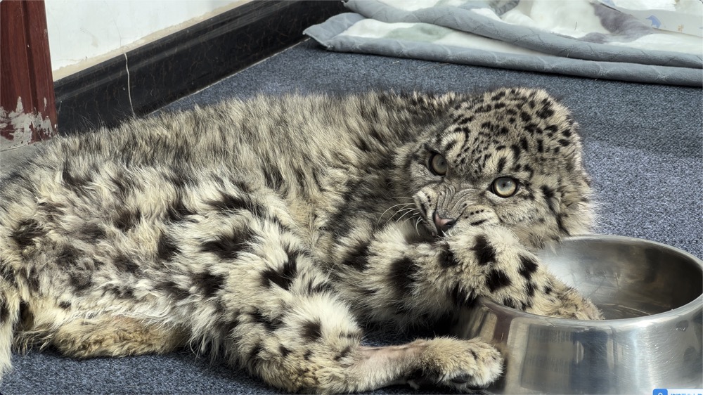 4月8日,國(guó)際珍稀動(dòng)物保護(hù)日。在青海野生動(dòng)物救護(hù)繁育中心,一只雪豹幼崽剛享用完兔排拌奶粉的“盆盆肉”,放松地躺在毯子上,身上灑滿了陽(yáng)光。