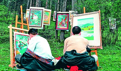 唐卡畫師在戶外作畫。張海麟 攝