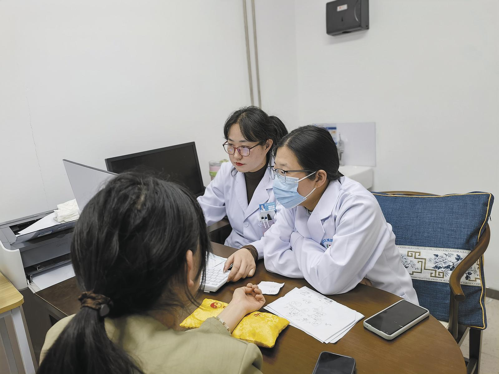 王晨曄(右一)和同事蘇蕾交流治療思路。咸文靜 攝