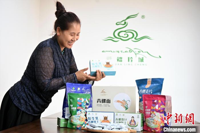 圖為“青稞姐姐”尕旦木草展示公司所研發(fā)的青稞產(chǎn)品。九美旦增 攝
