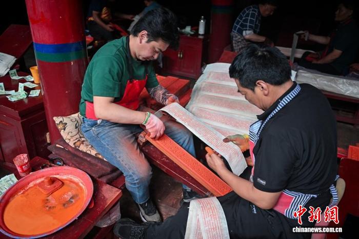 在藏版庫旁的印刷工坊里,10多名工匠正在忙碌。部分工匠手持墨刷,在《丹珠爾》印版上均勻涂墨,另一部分工匠不停翻轉印刷紙張或換新紙?!案瞎そ硞儗W了幾十年,從選料到印刷,每一步都不能急?!?2歲的西繞彭錯已在印經(jīng)院工作41年,他指著桌上用瑞香狼毒草根皮制成的印紙介紹,這種紙要經(jīng)過泡、煮、捶打等11道工序,“紙的韌性好,放幾十年都不會壞,蟲不蛀、鼠不咬,老祖宗傳下來的法子,錯不了?!闭f話間,西繞彭錯已將印紙平整鋪在版上,用特制印版輕壓,片刻后揭下,一行行雋秀的藏文便清晰呈現(xiàn)。正是這群工匠對傳統(tǒng)技藝的堅守,讓雕版技藝成為活態(tài)的文化遺產(chǎn)。