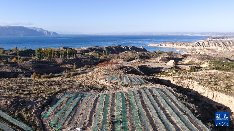 10月18日拍攝于青海省海南藏族自治州共和縣龍羊新村龍羊峽海湖漁業(yè)捕撈合作社的小銀魚晾曬網(wǎng)(無(wú)人機(jī)照片)。新華社記者 齊芷玥 攝