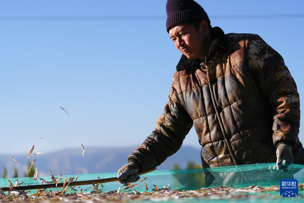 10月18日,在青海省海南藏族自治州共和縣龍羊新村龍羊峽海湖漁業(yè)捕撈合作社,一名工人將曬好的小銀魚抖散,以防在后續(xù)加工中出現(xiàn)粘連。新華社記者 齊芷玥 攝