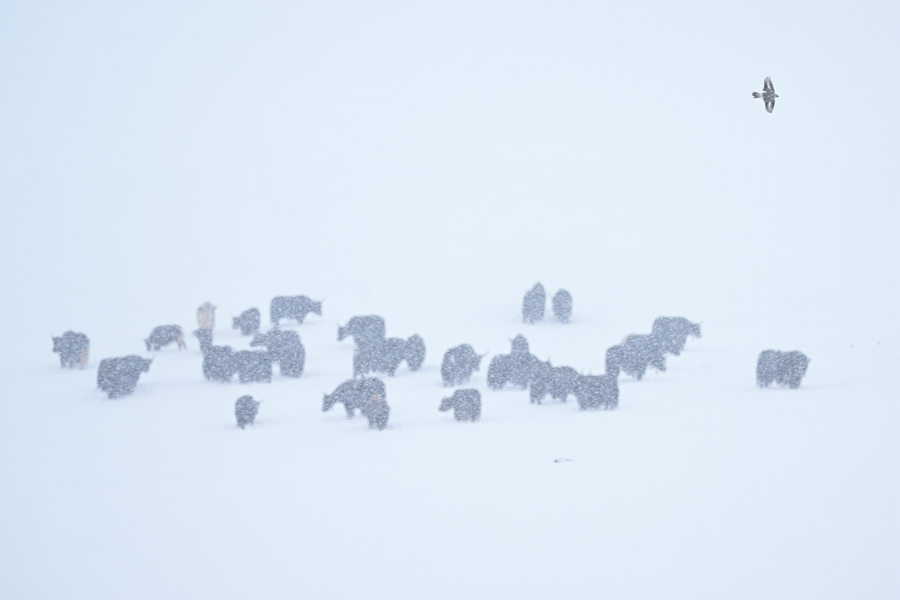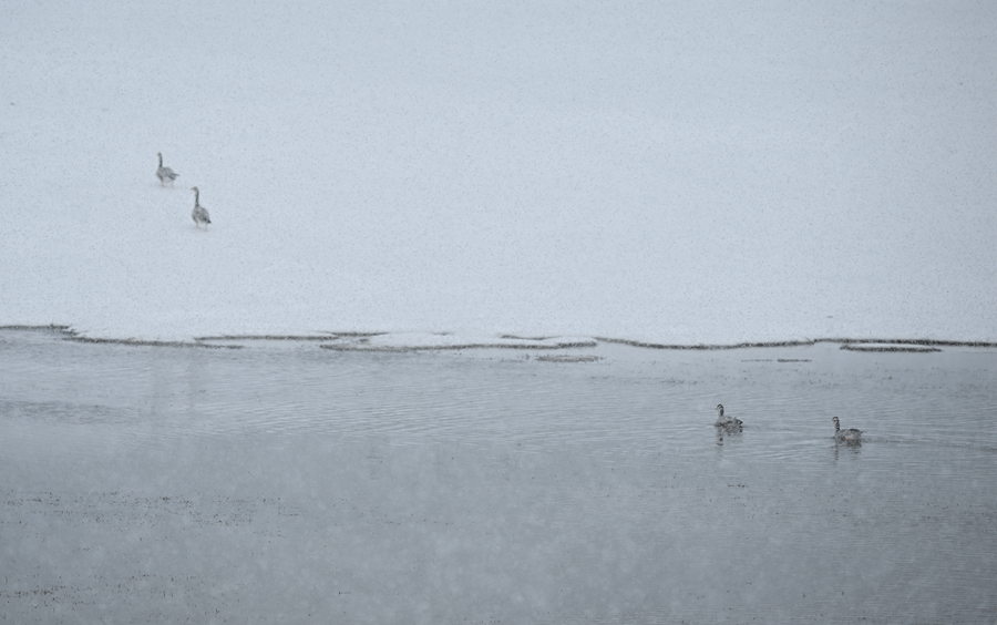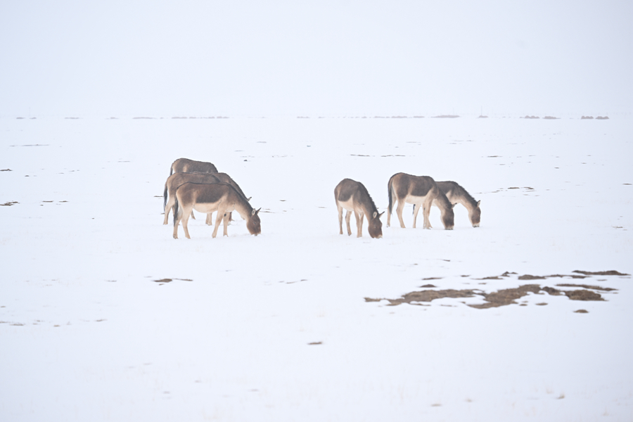 令人驚喜的是,風(fēng)雪中的源頭并不冷清。三五成群的藏野驢在緩坡上覓食,棕褐色的脊背上落滿雪花,卻走得從容不迫;幾只藏原羚從遠(yuǎn)處躍過雪地,靈巧的身影在風(fēng)雪中一閃而過,很快消失;斑頭雁貼著湖面低飛,時而盤旋,時而鳧水。這樣的場景,在當(dāng)?shù)厣鷳B(tài)管護(hù)員看來,已不罕見。