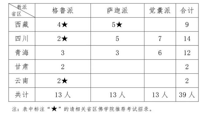 根據(jù)國家宗教事務(wù)局《藏傳佛教學(xué)銜授予辦法(試行)》,2018年我院計劃招收第十七屆高級學(xué)銜班39人,其中格魯派13人,薩迦派13人和覺囊派13人,學(xué)制三年。計劃在西藏招收9人,四川招收14人,青海招收12人,甘肅招收2人,云南招收2人。