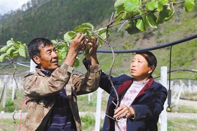 這位藏族大叔是李昌玉在獼猴桃基地收的“徒弟”可勇。“從去年6月獼猴桃基地平整土地開始,可勇就一直在這里,他很勤快,來得早走得晚,還經(jīng)常來請(qǐng)教問題,我就把他當(dāng)徒弟帶了,你看他現(xiàn)在都能自己發(fā)現(xiàn)問題了,我很欣慰,即使我以后離開了布巴村,還有他會(huì)這門技術(shù)?!崩畈窠忉屨f。