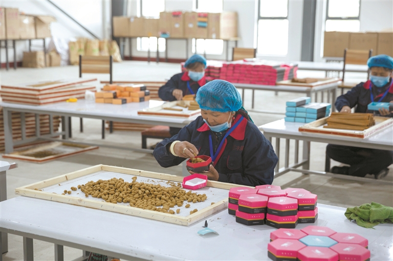 “靠山吃山、靠水吃水”,藏香已成為吞巴村民增收的支柱產(chǎn)業(yè)。圖為吞巴村民在寬敞明亮的現(xiàn)代化廠房?jī)?nèi)分裝藏香成品。孫靖宇攝