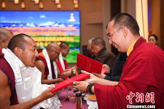 9月10日,中國佛教協(xié)會西藏分會第四屆藏傳佛教教義闡釋論壇暨堅持藏傳佛教中國化方向研討會在日喀則市舉行。圖為全國政協(xié)常委、中國佛協(xié)副會長、中國佛協(xié)西藏分會會長班禪額爾德尼·確吉杰布(右)為優(yōu)秀闡釋論文作者頒獎。中新社記者 何蓬磊 攝