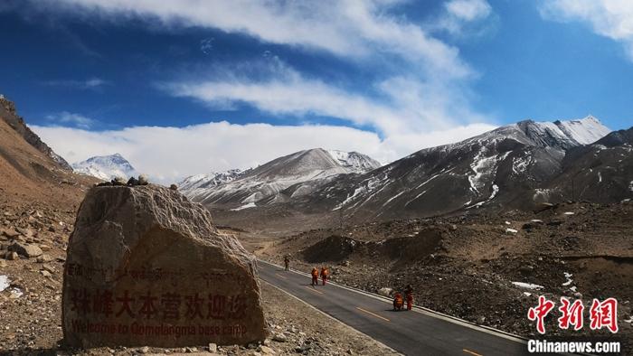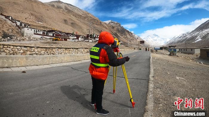 圖為4月11日,在西藏日喀則市定日縣,國測一大隊隊員在珠峰登山大本營附近開展精密水準(zhǔn)測量工作。 中新社發(fā) 魏軍輝 攝