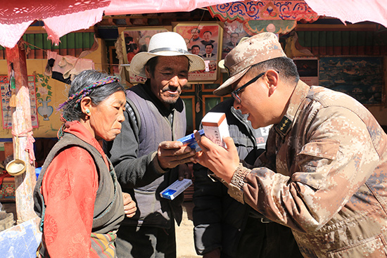 車子剛停穩(wěn),聞訊而來的村民們就排起了長隊。索朗貢布頂著炎炎烈日穿梭在人群中耐心進行翻譯,哪位老人該測量血壓,哪位患者該領取藥品了然于胸,兩個小時過去了都顧不上喝一口水。該部隊衛(wèi)生員應曉晶介紹說,每次義診他們天不亮就起床準備,天黑才匆匆返營,中途餓了就啃幾口干糧,然而只要索朗貢布工作抽得開身,就一定隨隊前往,確保每次義診更加順利圓滿。