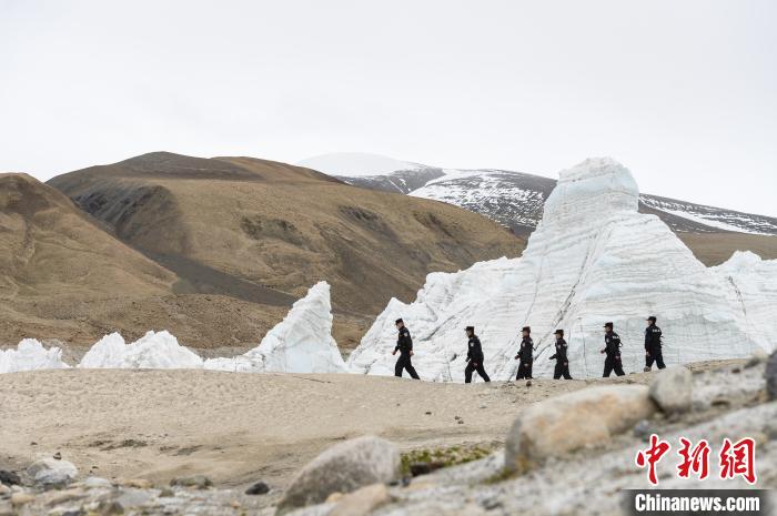 普瑪江塘邊境派出所民警在常年執(zhí)勤的地方——平均海拔5600米左右的崗布冰川無人區(qū)巡邏。何蓬磊 攝