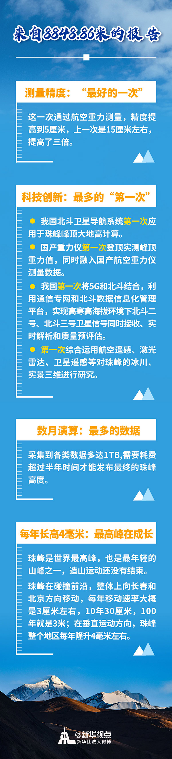 8848.86米:作為世界最高峰的珠穆朗瑪峰最新“身高”8日公布。自然資源部權(quán)威人士說,同上一次測(cè)量結(jié)果相比,此次測(cè)量數(shù)據(jù)的科學(xué)性、可靠性、創(chuàng)新性,都達(dá)到一個(gè)新高度。