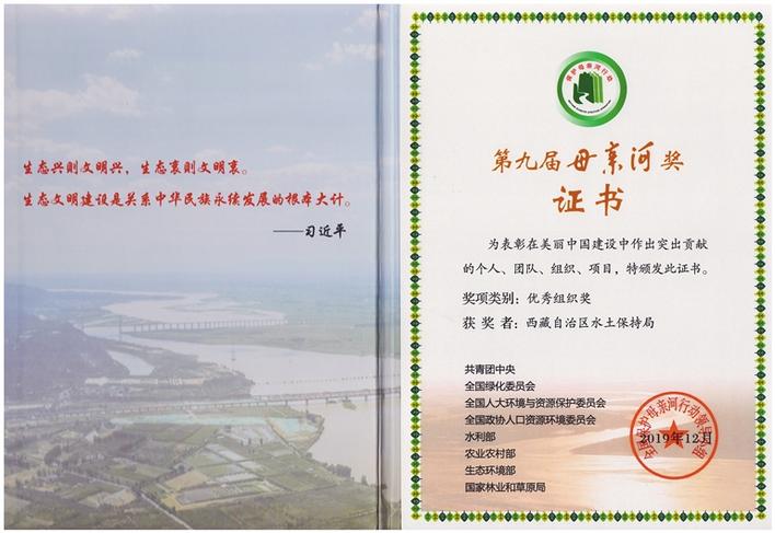 圖為西藏自治區(qū)水土保持局獲得“第九屆母親河優(yōu)秀組織獎”獲獎證書。
