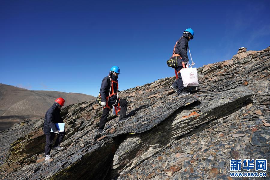 在西藏山南市洛扎縣,國家電網(wǎng)山南供電公司輸電運檢中心員工龔朝偉(右)和國家電網(wǎng)安徽省電力有限公司援藏工作人員徐四勤(中)、吳寅(左)向浪洛線197號鐵塔前進(2020年11月4日攝)。新華社記者詹彥 攝