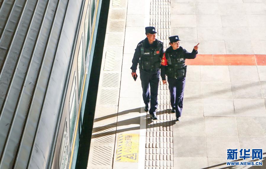 1月10日,“女子格桑花”警組民警雷穎君(右)與同事在火車站里巡邏。新華社發(fā)(胡安鵬、黃飛攝影報道)