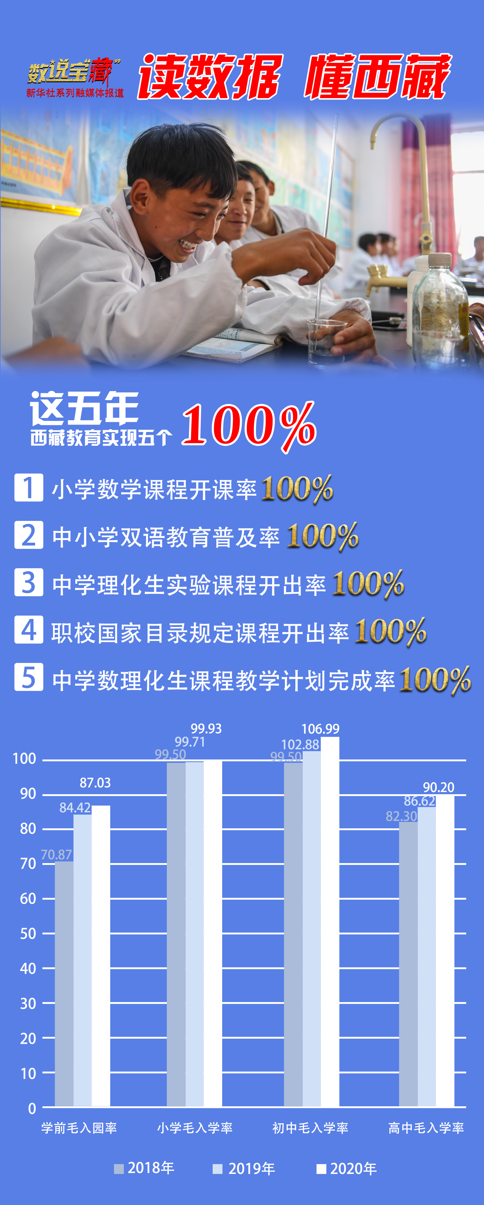 “五個100%”教育目標是西藏基礎(chǔ)教育重點工程的主要內(nèi)容,于2016年正式確定。西藏在資金投入、教師培訓、實驗設(shè)備和儀器配備等方面給予學校支持,并重點加強理科教學和實驗教學,強化教師專業(yè)技能培訓。對此,西藏先后投入2.12億元新建中小學實驗室60萬平方米,投入1.99億元采購中小學實驗教學儀器設(shè)備等。