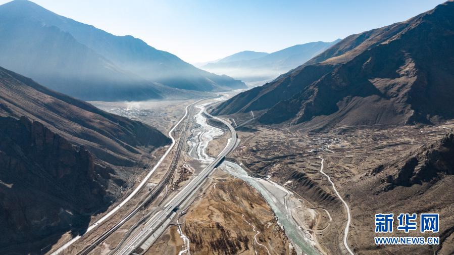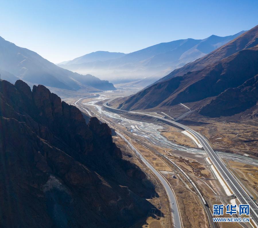 這是拉薩至那曲間的交通線路(1月28日攝,無(wú)人機(jī)照片)。從左到右依次為109國(guó)道、青藏鐵路、高等級(jí)公路、鄉(xiāng)村公路。新華社記者 晉美多吉 攝