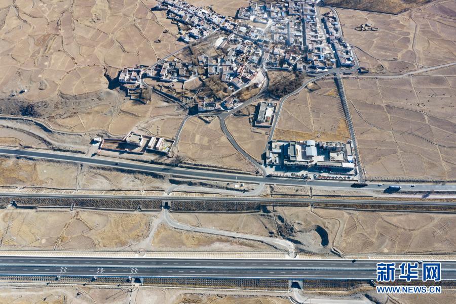 這是拉薩至那曲高等級(jí)公路(下)和青藏鐵路沿線村莊(1月28日攝,無(wú)人機(jī)照片)。新華社記者 孫非 攝