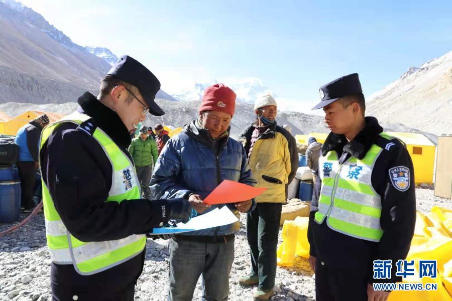 在珠峰大本營執(zhí)勤點(diǎn),民警開展普法宣傳(2月攝)。新華社發(fā)(鄭勁松 攝)