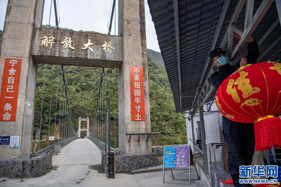 在解放大橋執(zhí)勤點,西藏林芝邊境管理支隊墨脫大隊背崩邊境派出所的民警在懸掛紅燈籠(2月10日攝)。新華社記者 孫非 攝
