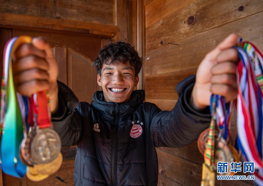 在位于西藏林芝市墨脫縣德興鄉(xiāng)巴登則村的家中,旺前羅布展示自己獲得的獎牌(2月9日攝)。新華社記者 孫非 攝