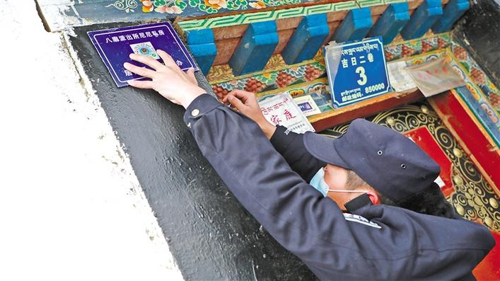 圖為八廓派出所民警在居民大院門口張貼居住證“碼”上辦二維碼。格桑倫珠 尼瑪拉珍 攝