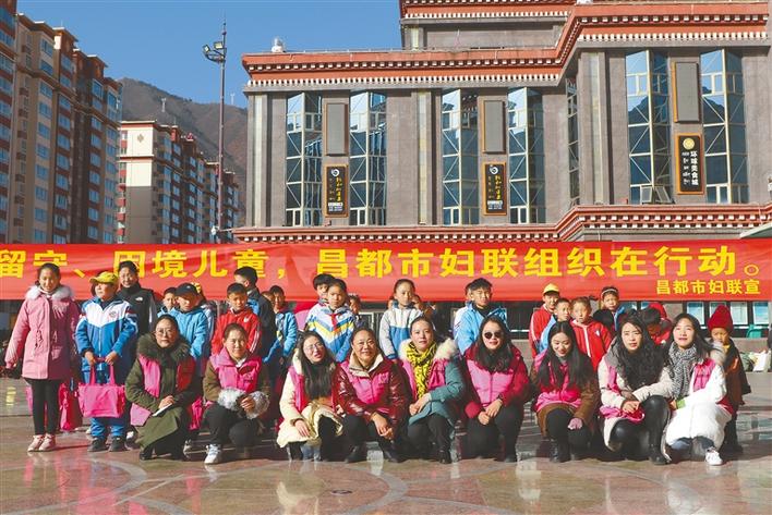 昌都市婦聯(lián)為家庭困難學(xué)生發(fā)放書包。