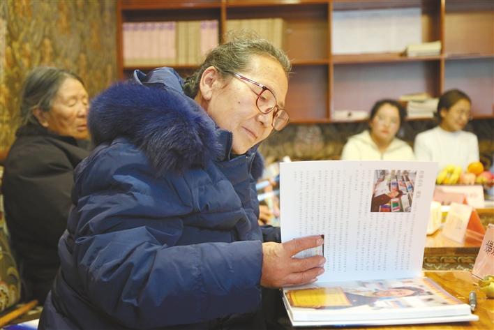 圖為昌都市婦聯(lián)組織老黨員干部查看“70人70事獻(xiàn)禮畫冊”?! ?/p>