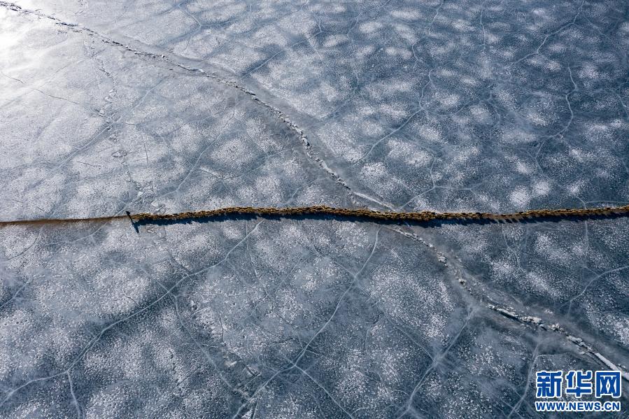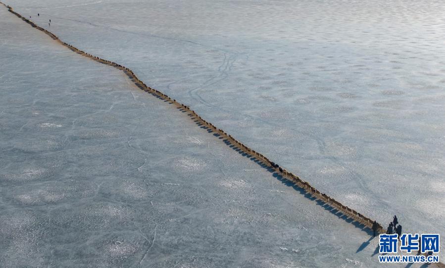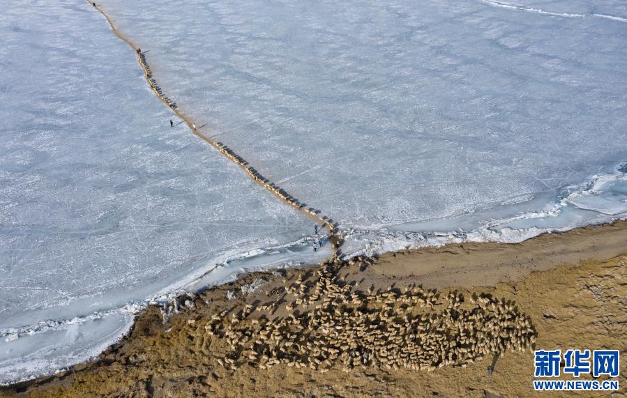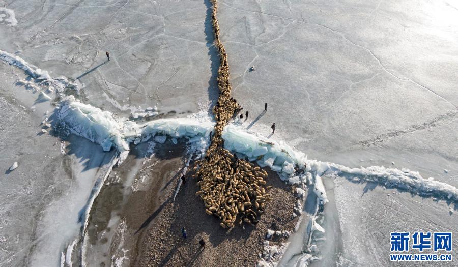 2000多只羊,在冰湖上如一條長(zhǎng)長(zhǎng)的線,緩緩前行……
